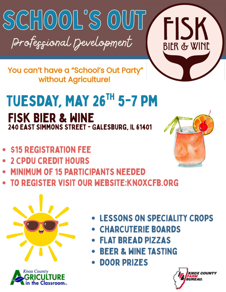 Join us - Tuesday, May 26, 2026 from 5-7PM at Fisk Bier & Wine for a "School's Out" PD Session focused on Specialty Crops, where you will gain fresh ideas and practical lessons to take back to your classroom! Earn 2 CPDU Credit Hours and enjoy a delicious spread of charcuterie boards, flatbread pizzas, along with beer and wine tastings as you connect with fellow educators and unwind after a busy year. Registration is $15. A minimum of 15 participants is needed.